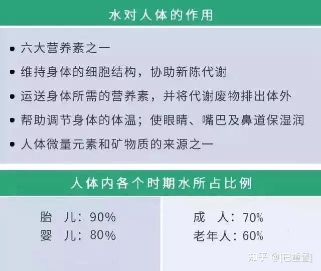 人体内发生的一切化学反应都是以水作为介质而进行的。没有水,养料不能被吸收;氧气不能输送到所需的部位;营养物也不能到达它的作用部位;废物不能排出;新陈代谢将会停止。